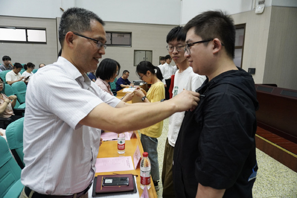 与会老师为新发展党员代表佩戴党章。