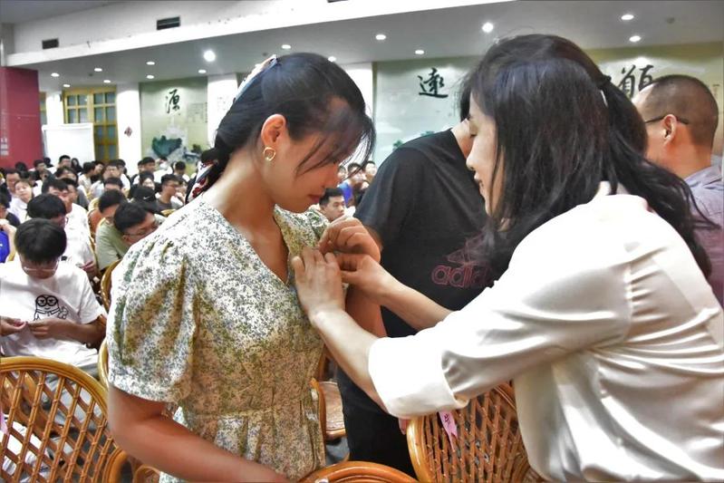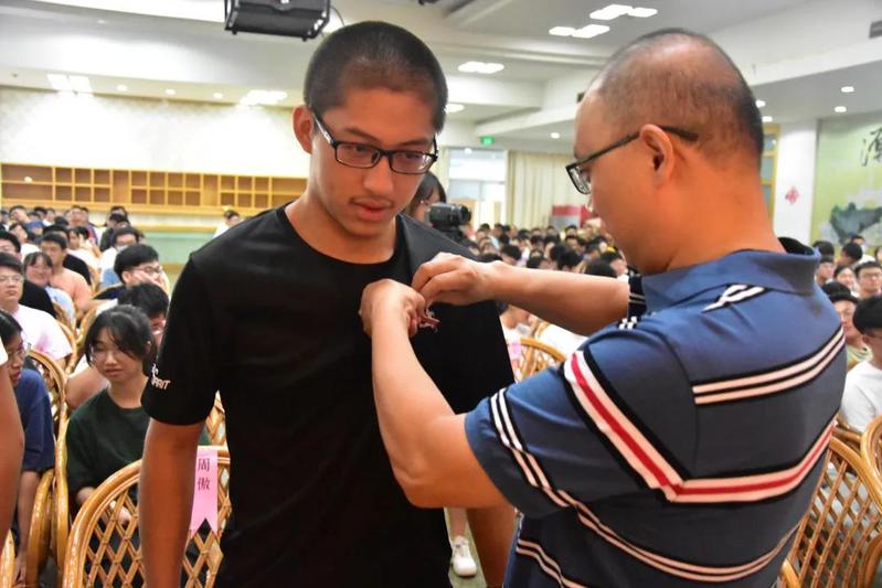 (老师们为新生代表佩戴校徽)