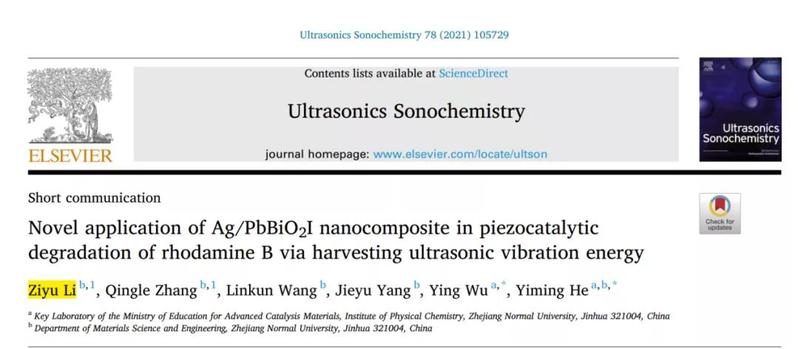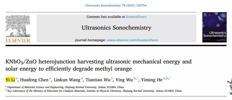 近期,浙江师范大学“光催化材料”大学生创新工作室、物电学院何益明课题组18级材料科学与工程专业本科生李紫玉和李怡同学,以第一作者身份分别在中科院一区期刊Ultrasonics Sonochemistry(2020年影响因子为7.491)上发表题为“Novel application of Ag/PbBiO2I nanocomposite in piezocatalytic degradation of rhodamine B via harvesting ultrasonic vibration energy” 和“KNbO3/ZnO heterojunction harvesting ultrasonic mechanical energy and solar energy to efficiently degrade methyl orange”的研究论文,论文指导老师为物电学院的何益明教授。