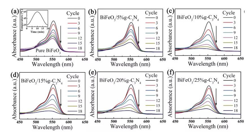 近日,材料科学与工程专业本科生陈明子同学在导师的指导下,制备了BiFeO3/g-C3N4 异质结构,获得了优异的热释电催化染料降解效果。对于BiFeO3/10% g-C3N4异质结材料,其催化效果最佳,在25~65摄氏度冷热变化下,大约经历18个冷热循环,对于罗丹明B染料的降解率可达94.2%左右,这远高于纯的材料(同样条件下对染料的降解率约67.7%)。通过构筑异质结,实现了正负载流子的分离效率,从而提高了催化效果。