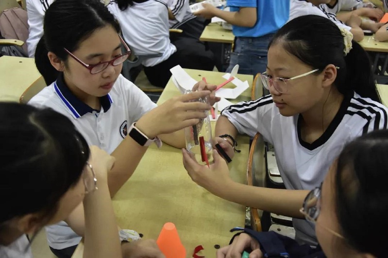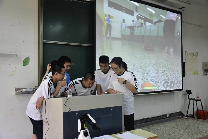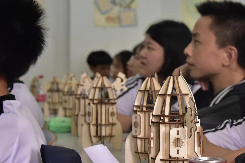 下午,在23幢教室开展了航空航天工坊室内研学活动。激光切割模块,在学院专业老师的理论讲解后,助教们下发用激光切割工艺制作而成的火箭模型零件。中学生们拆下火箭模型的零件,在老师的示范讲解、助教们的帮助下,一点一点的拼接,完成了他们手中的神州十二号火箭模型,火箭模型简单精致,孩子们开心地带回了家;机械臂部分,由助教们演示机械臂的吸盘、写字功能,孩子们连连发出惊叹,之后由他们自己尝试使用机械臂完成这些功能;机甲战车模块,简单地讲解原理和展示后,在助教陪同下,他们操纵着机甲战车进行对战、射击、躲避。每一个模块都让孩子们真实感受的到科学技术的快速发展和广泛普及。