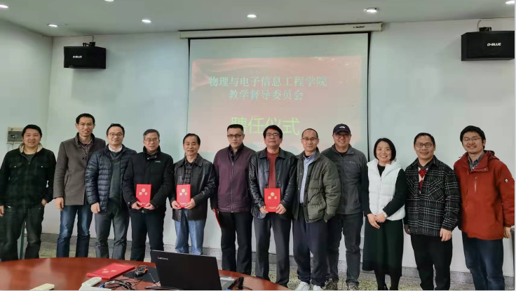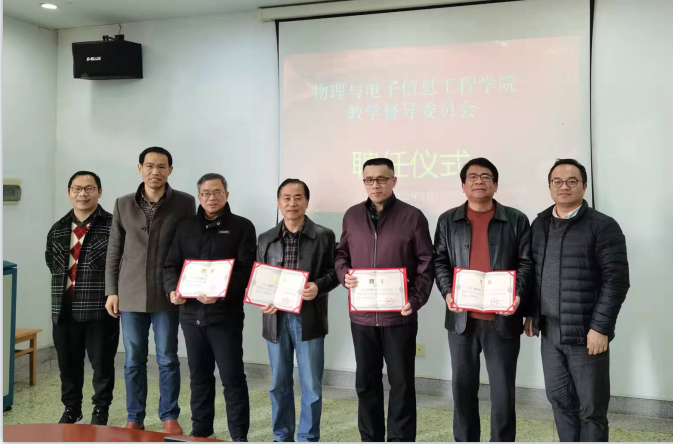 物电学院聘任宗丰德、童国平、汪金山、许学军、彭保进为新一届教学督导委员,学院院长李盛为教学督导颁发聘书,并希望教学督导为学院的课堂教学质量把关,为青年教师课堂教学水平提升助力。