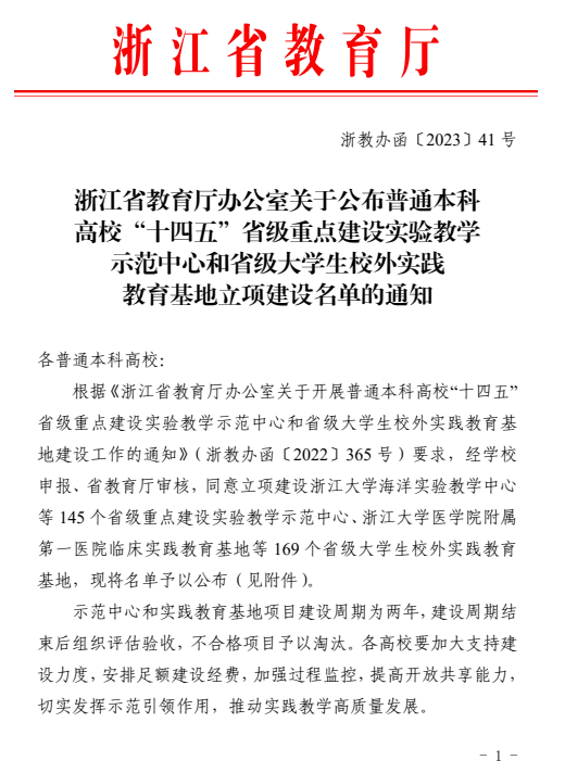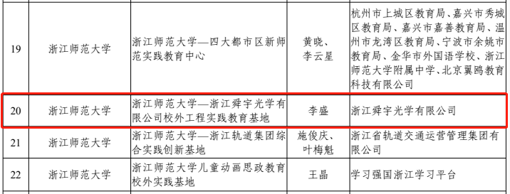 近日,浙江省教育厅办公室公布普通本科高校“十四五”省级重点建设实验教学示范中心和省级大学生校外实践教育基地立项建设名单,我院李盛院长牵头申报的《浙江师范大学—浙江舜宇光学有限公司校外工程实践教育基地》获批省级大学生校外实践教育基地。