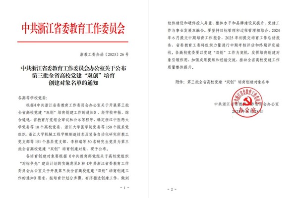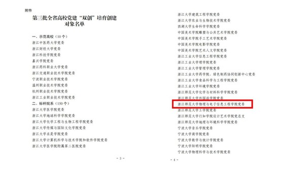 近日,中共浙江省委教育工作委员会办公室公布了第三批全省高校党建“双创”培育创建对象名单。物理与电子信息工程学院党委入选第三批全省高校标杆院系培育创建单位。