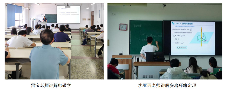 雷宝老师在《普通物理-电磁学》课程中,从常见的电感现象进入,由浅入深,向同学们揭示了电磁学自感和互感的奥秘。他详细讲解了自感和互感的原理及两者之间的区别,并从理论层面过渡到实际应用,让同学们在理解电磁学是如何融入日常生活的同时,也能深刻感受到物理学由表及里、从现象到本质的辩证认知规律。沈亚西老师在《大学物理B》课堂上以循序渐进的方式,讲解了安培环路定理及其应用,运用严谨的数学推导,得到沿不同路径下积分结果的一致性,阐述了安培环路定理的物理内涵,通过从特例情况到一般情况的总结,引导同学们看待事物或评论问题不能以偏概全,以点代面,要多角度全面地分析问题。