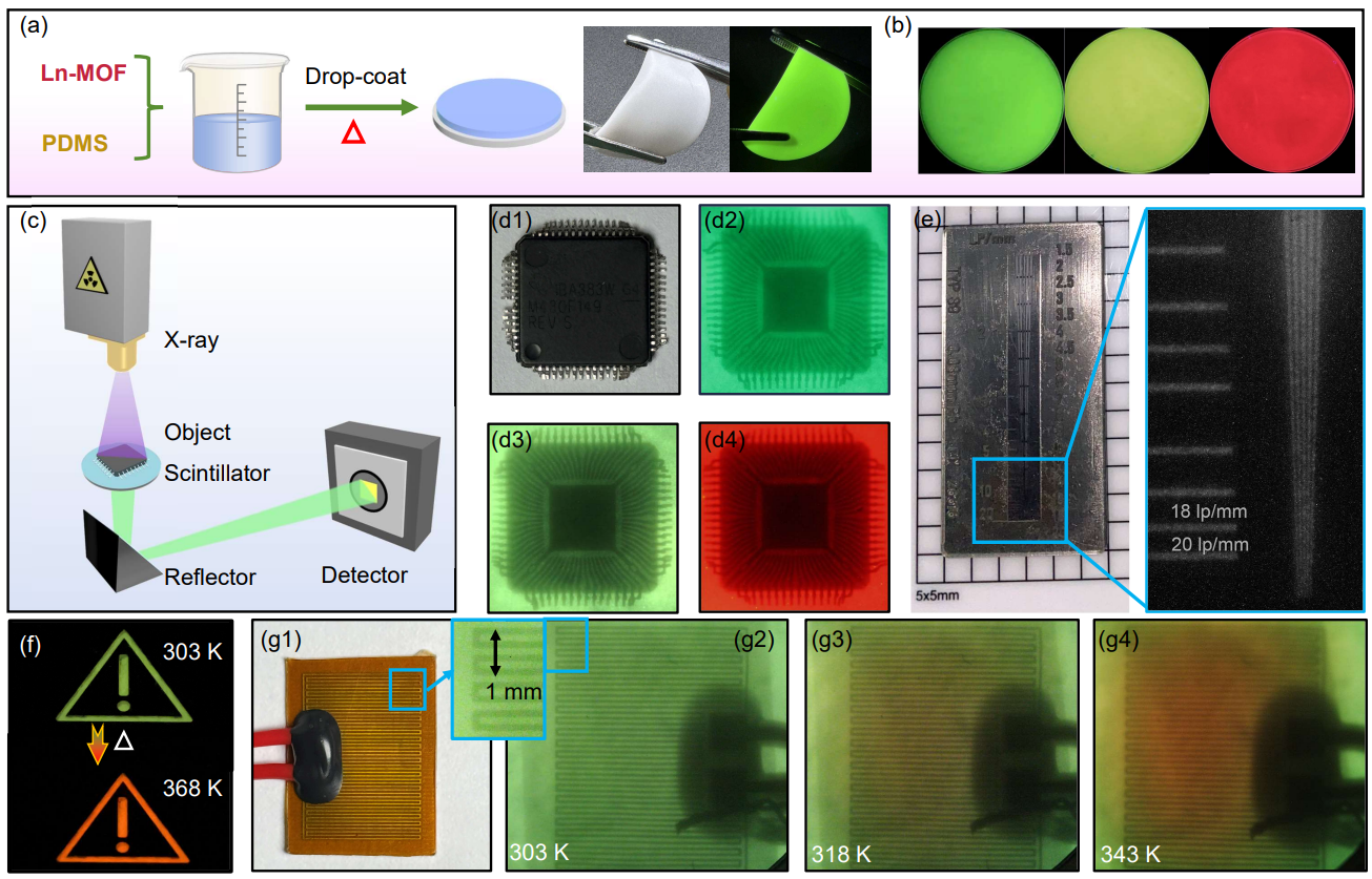 进一步将Ln-BPTC闪烁体与高分子聚合物复合,制备成柔性混合基质薄膜,实现了对物体内部构造的X射线成像,最高空间分辨率可达18 lp mm-1。其中,利用Tb0.95Eu0.05-BPTC复合膜不仅能够获得物体内部结构的清晰图像,还能够在物体局部发热区域产生明显的发光颜色改变,进而实现了原位X射线成像中对温度变化的可视化响应。这是首个具有热致发光变色特性的闪烁体薄膜材料。