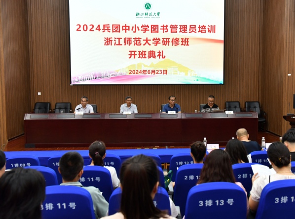 6月23日上午,2024年兵团中小学图书管理员培训浙江师范大学研修班开班。原兵团教育局党组书记、局长黎兴平,浙江师范大学继续教育与合作办学管理处副处长罗福建,浙江师范大学物理与电子信息工程学院党委书记周军强,班主任吴琼以及来自兵团直属学校和各师中小学图书管理一线的老师共50余人参加开班典礼。