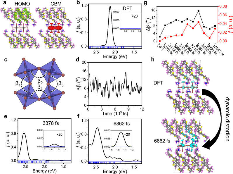 浙江大学课题组采用时间分辨的光谱技术对(BTm)2PbI4体系的研究发现,除了[PbI]2-和BTm+产生的吸收峰之外,在(BTm)2PbI4体系还存在一个低于带隙的吸收峰,进而驱动光子的上转换过程,从而需要深入理解该低于带隙的吸收峰特性及产生机制。为此,南广军课题组结合密度泛函理论、适用于大尺度体系的含时密度泛函理论以及从头算分子动力学方法,理论研究了(BTm)2PbI4体系的电子结构和振子强度。理论研究指出该体系具有II型的电子能级排列,认为低于带隙的吸收峰是电荷转移激子。当考虑晶格振动时,理论研究精准再现了实验观测的吸收光谱,揭示BTm+动力学诱导的[PbI4]2-晶格畸变以及BTm+相对于[PbI4]2-晶格的对称性破缺是产生低于带隙的吸收峰的物理起源。这为进一步设计光子上转换的二维钙钛矿材料提供了新设计原理。