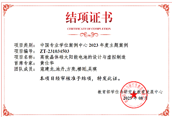 近日,教育部学位与研究生教育发展中心发布2023年度主题案例项目的结项通知,物电学院黄仕华教授主持的主题案例项目《高效晶体硅太阳能电池的设计与虚拟制造》(编号:ZT-231034503)顺利通过验收,共有3篇案例成果入选中国专业学位案例中心案例库。